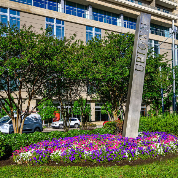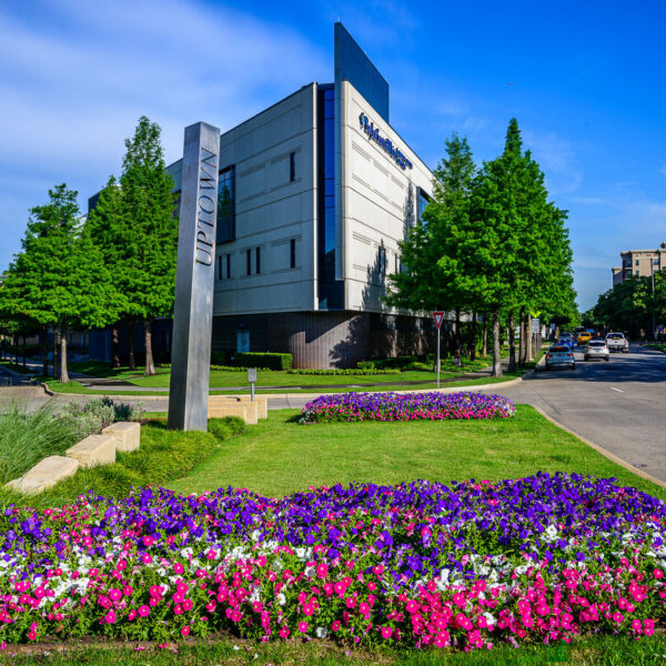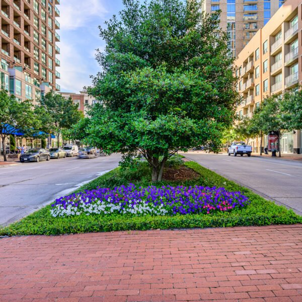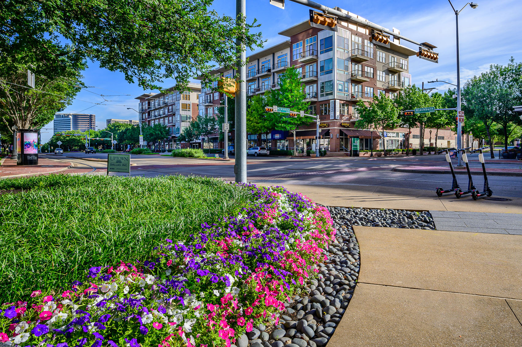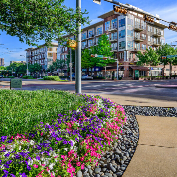 This vibrant landscaping project transforms a prominent intersection in the heart of Uptown Dallas’s West Village district, at the bustling corner of McKinney Avenue and Blackburn Street.