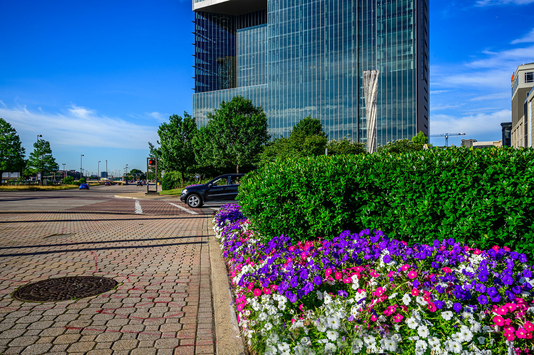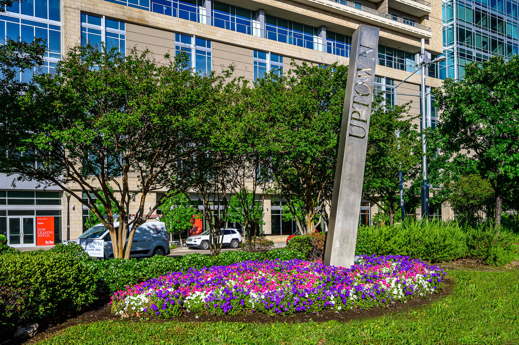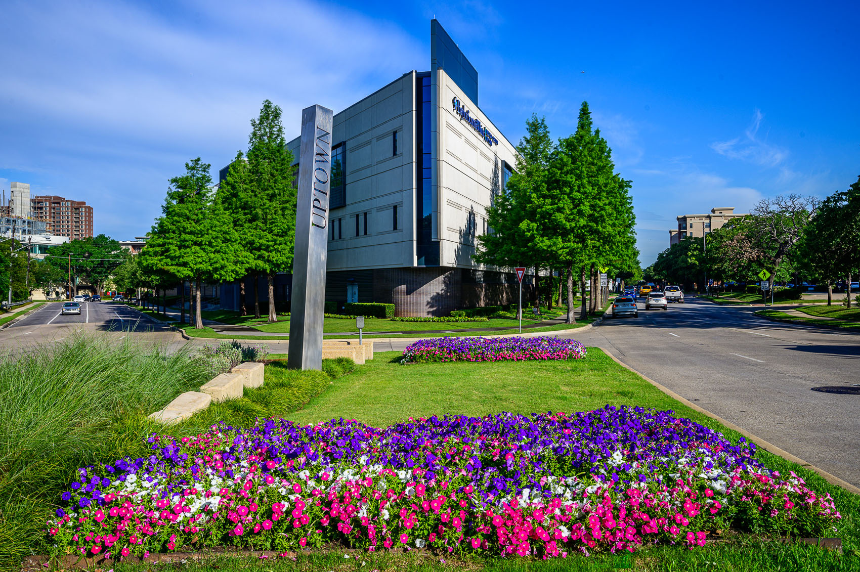 This vibrant landscaping project transforms a prominent intersection in the heart of Uptown Dallas’s West Village district, at the bustling corner of McKinney Avenue and Blackburn Street.