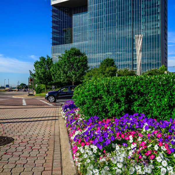 Our team designed and installed a stunning, eye-catching seasonal flower bed that wraps gracefully around the pedestrian-friendly median and sidewalk edge. Featuring a rich, colorful palette of purple, pink, white, and blue annuals—including petunias, calibrachoa, and complementary blooms—the curved bed creates a lush, welcoming oasis amid the urban energy of high-rise apartments, trendy shops, and passing traffic.